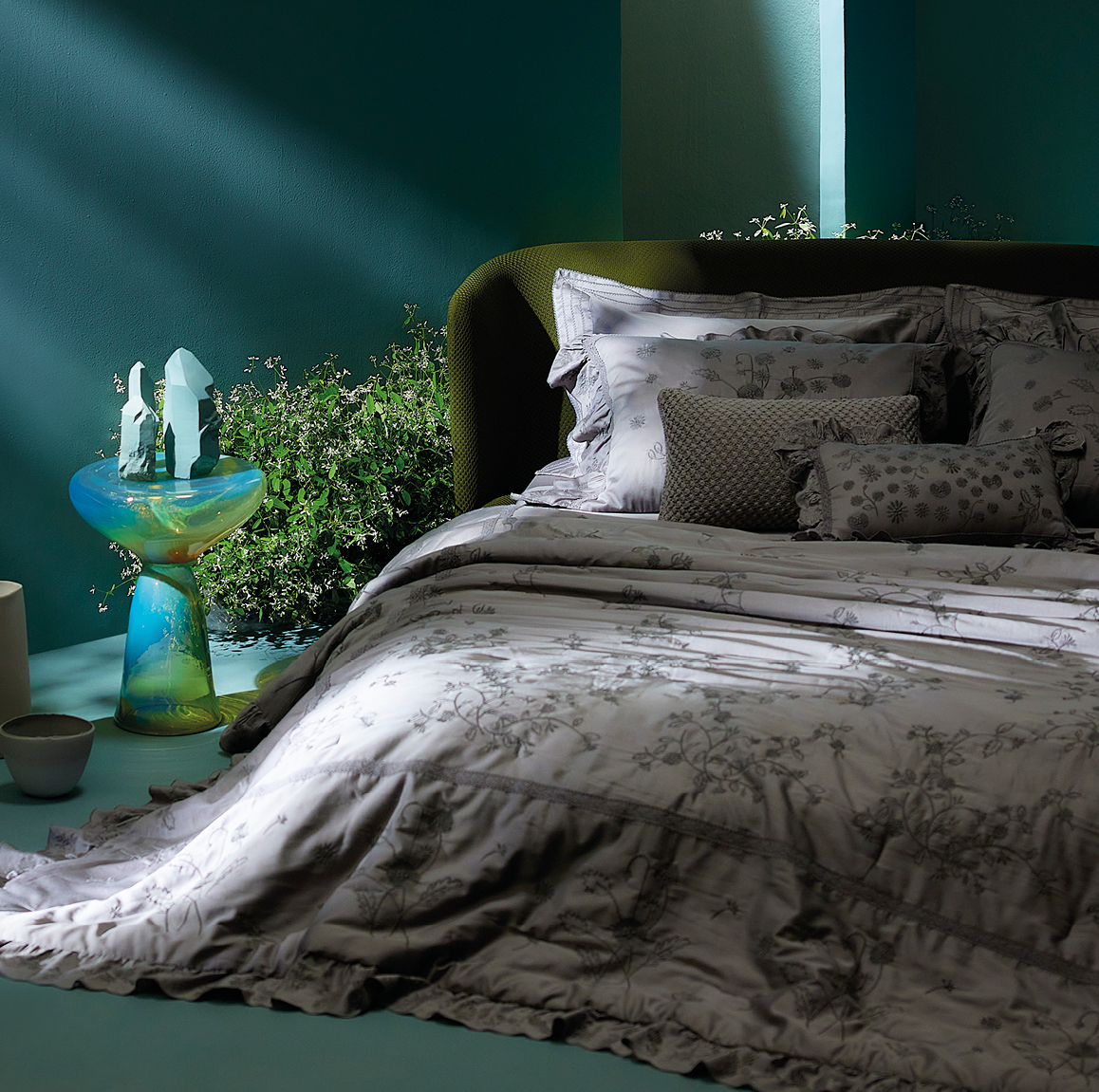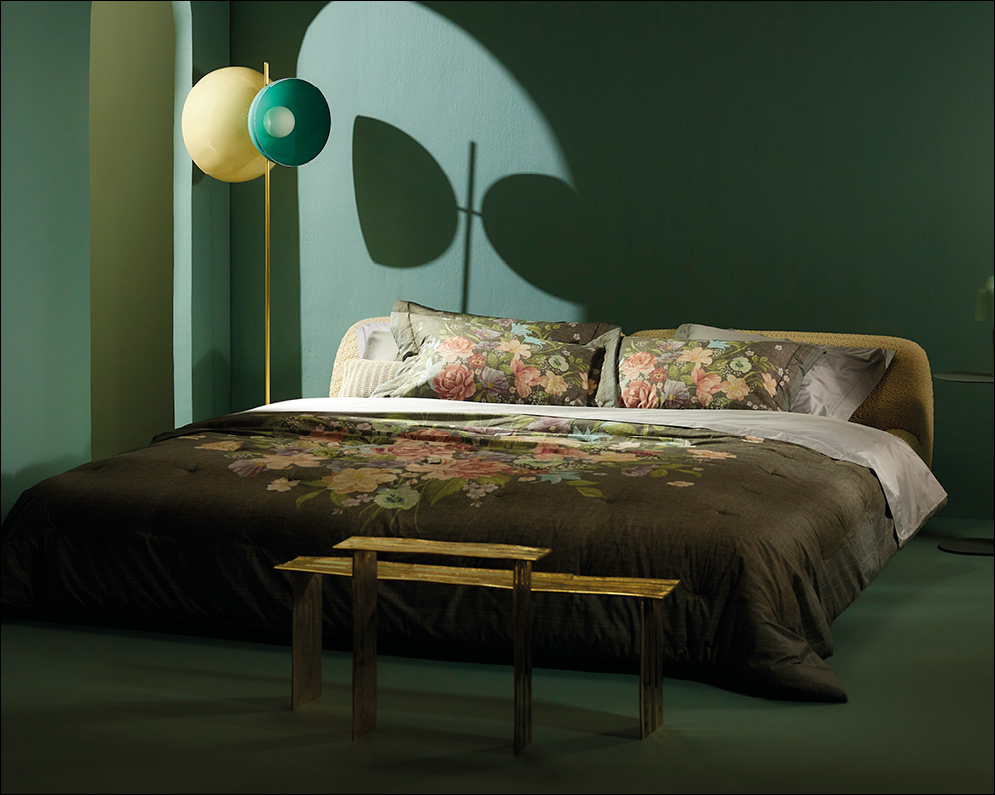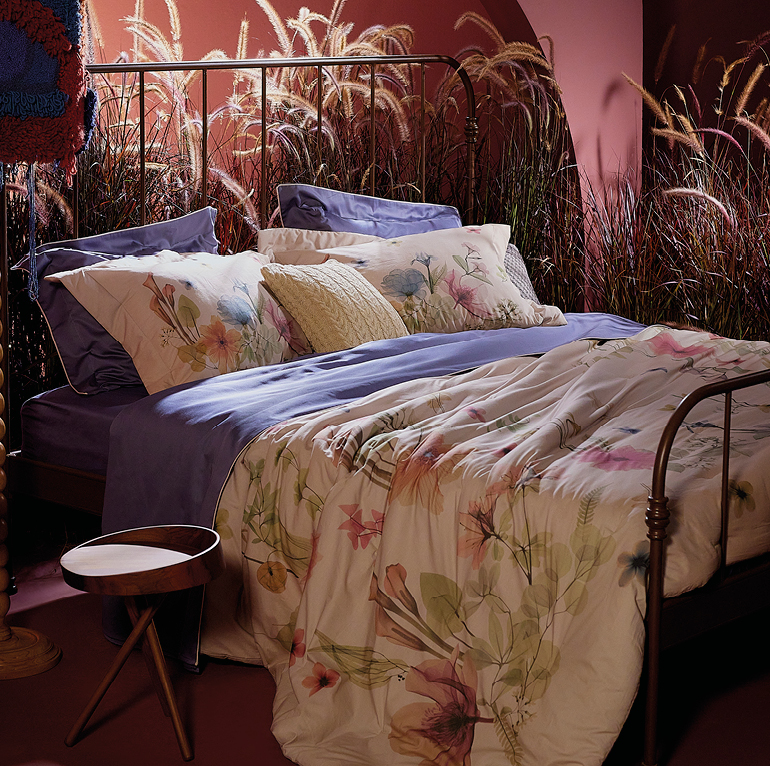 A exuberância das paisagens externas habita o ambiente interno, através estampas digitais ricas em detalhes para a cama que evocam aquarelas botânicas em estampas florais.