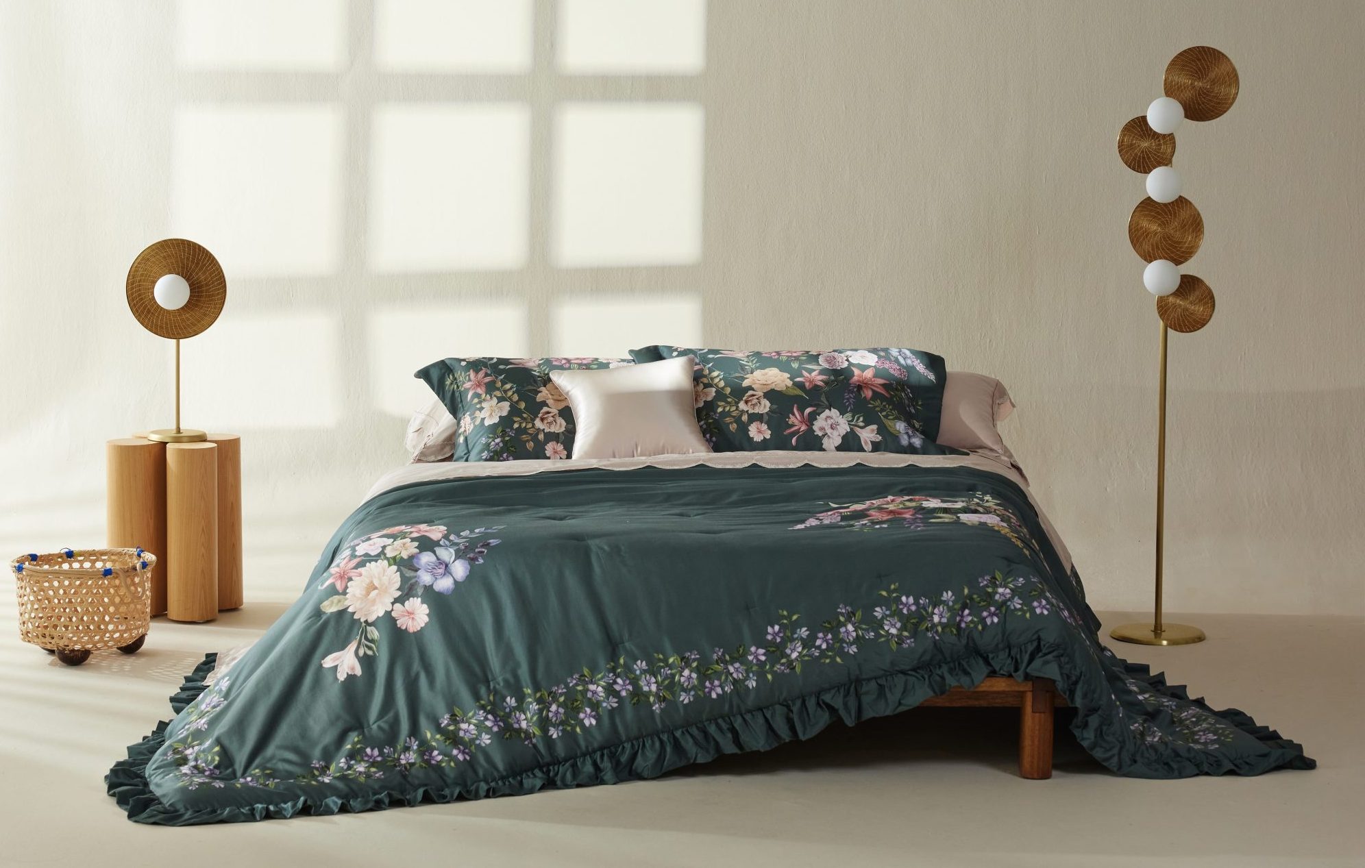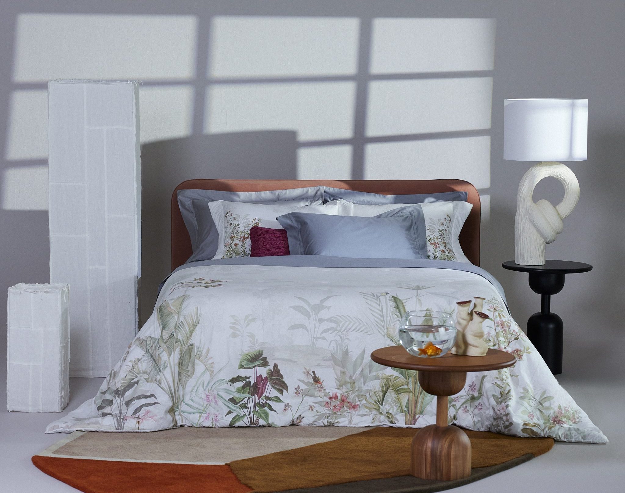 A exuberância das paisagens externas habita o ambiente interno, através estampas digitais ricas em detalhes para a cama que evocam aquarelas botânicas em estampas florais.