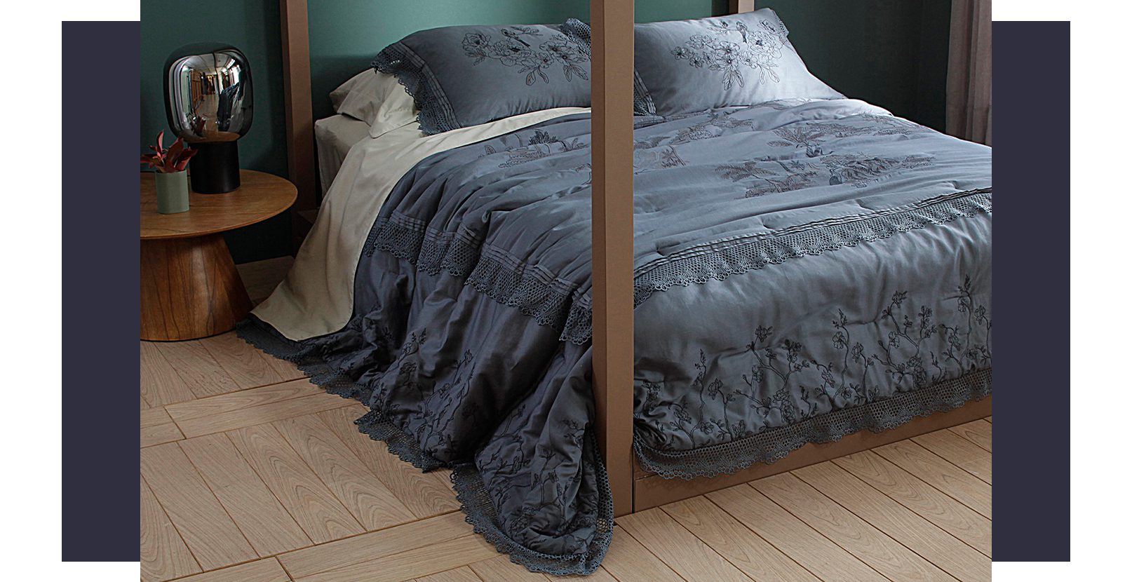 Bordados, aplicações e recortes em tons, estampas digitais em alta definição constroem colchas com designs que se destacam pela elegância naturalmente bela e confortável, permitindo produções de meia-estação glamourosas para o quarto.