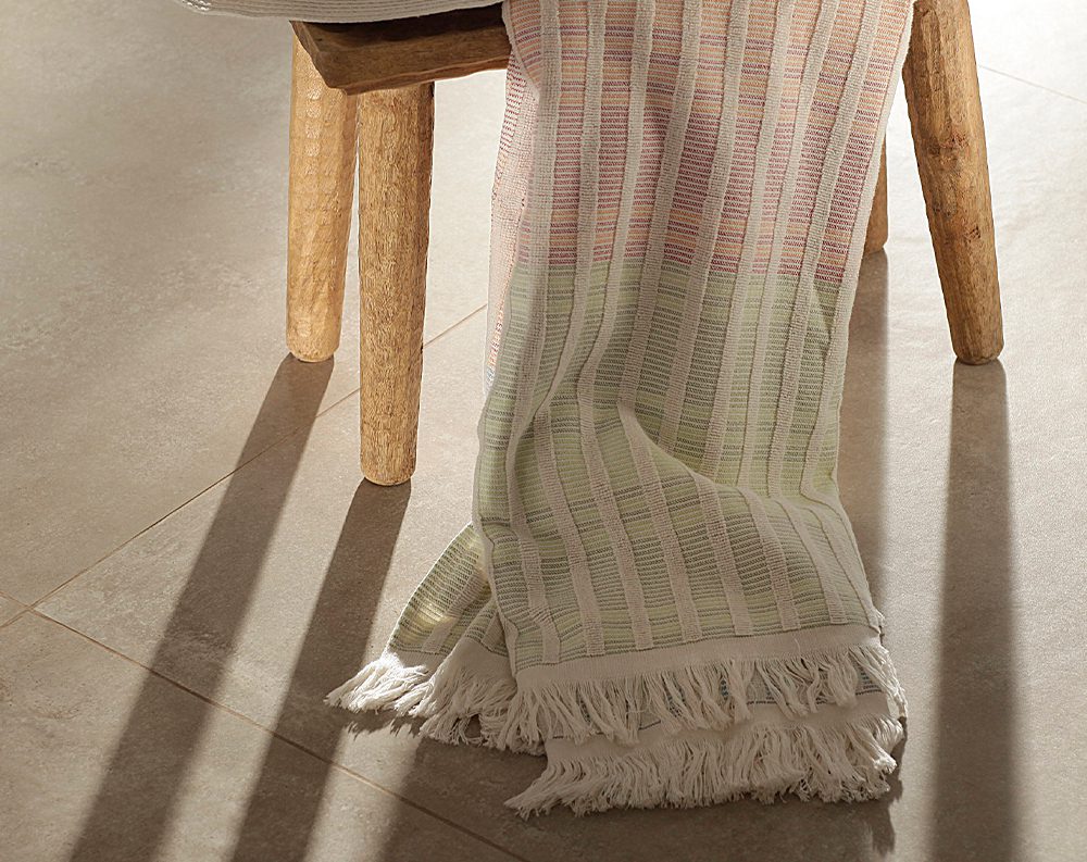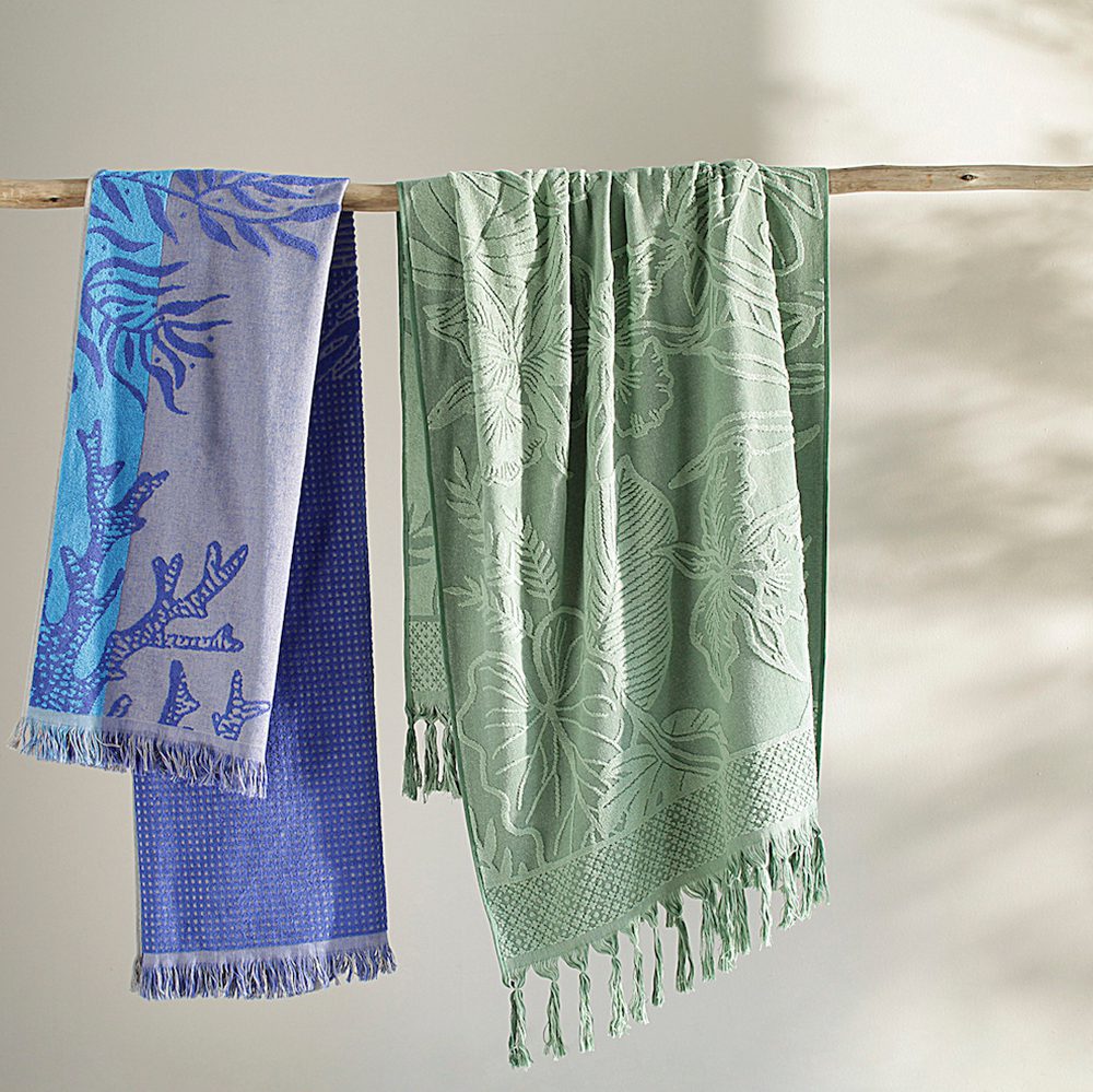 Tamanhos generosos, beleza e versatilidade marcam as toalhas com franjas. Designs desenvolvidos por meio de interessante combinação de fios e tramas criam um efeito estético particular a cada modelo, com destaque para as franjas nas extremidades. Na praia ou na piscina, as peças chamam atenção por onde passam.