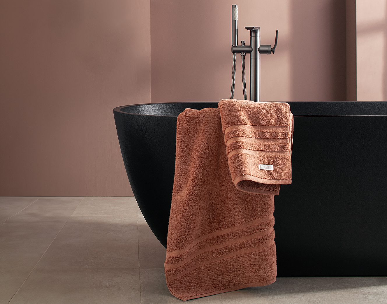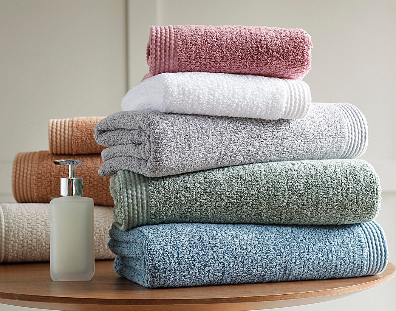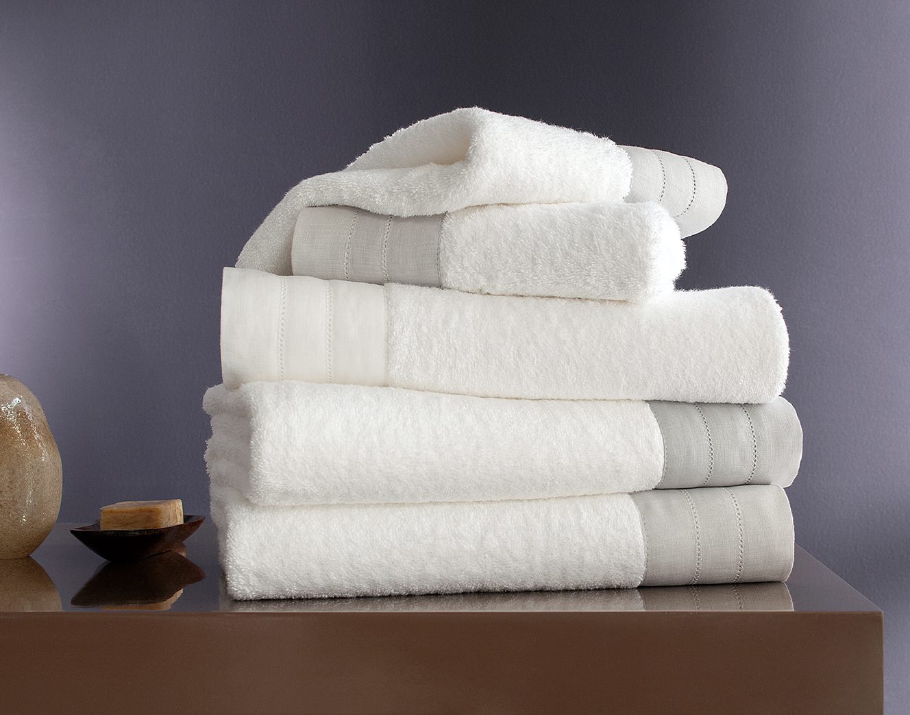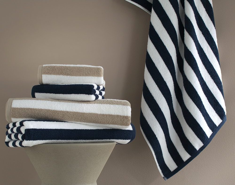 Jogos de toalhas que envolvem o corpo com volume pronunciado, maciez absoluta e absorção máxima, com o mais puro algodão, acabamentos em jacquard, veludo ou feitos da tecnologia exclusiva Air Cotton.