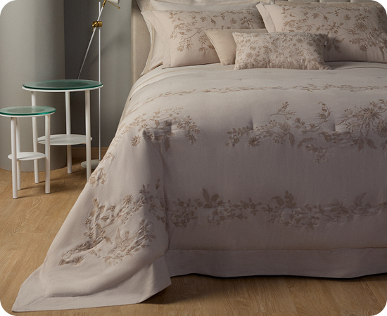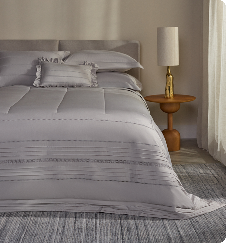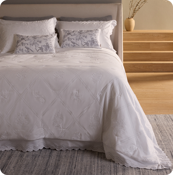 A Colcha Arlo resgata a delicadeza dos enxovais de herança em uma leitura sofisticada e atemporal. Confeccionada em percale 100% algodão, revela bordado inglês em whitework que desenha flores, pássaros e treliças inspirados na estética toile francesa.