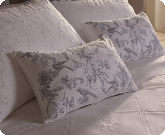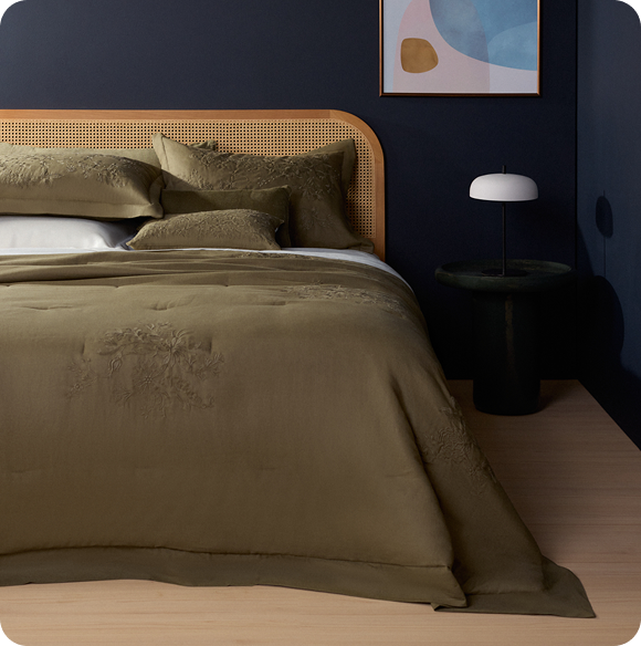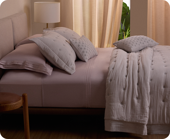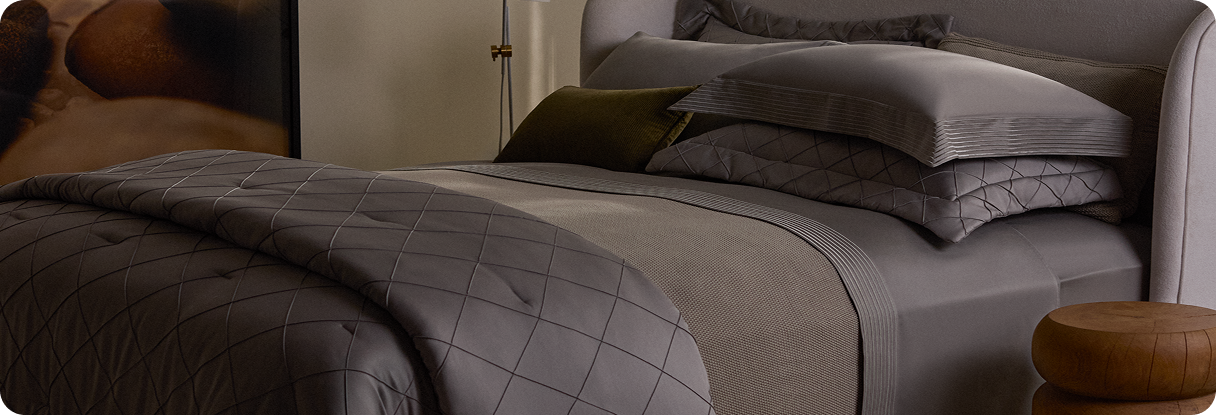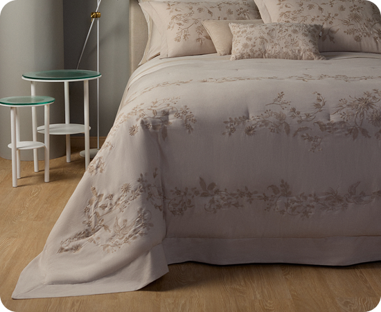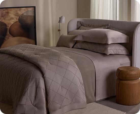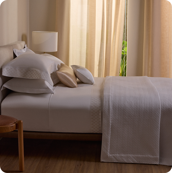 As colchas revelam a riqueza das texturas e a delicadeza dos acabamentos. Bordados minuciosos, matelassados sofisticados e superfícies macias valorizam a cama com elegância e conforto, criando composições acolhedoras que convidam ao descanso.